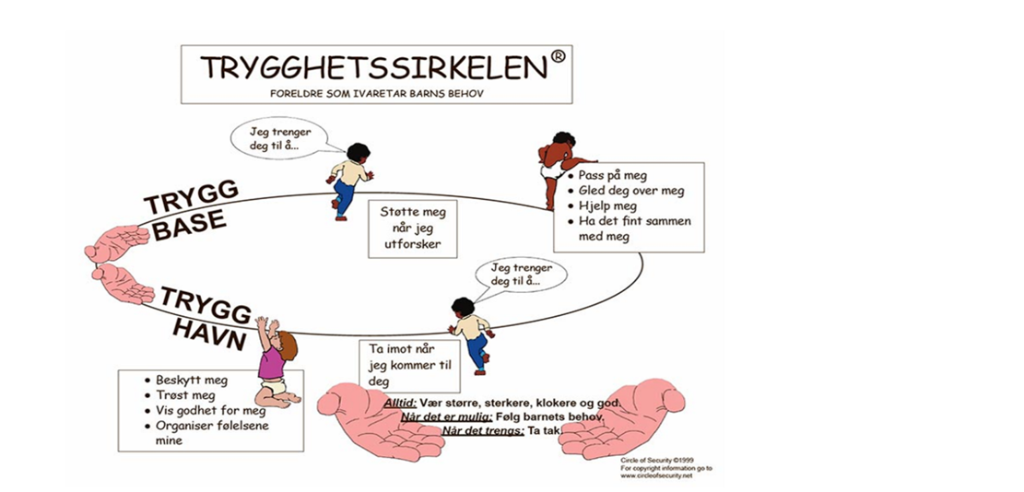 I Sørliveien barnehage får alle barn en egen tilknytningsperson som følger barnet tett den første tiden i barnehagen, etter tilvenningsperioden blir barnet gradvis kjent med de andre voksne og barn i barnehagen. Vi toner oss inn på barnets signaler og tilpasser lek og aktiviteter etter dette. Dette praktiserer vi ved å bruke trygghetssirkelen (Circle of Security, COS) aktivt i det daglige arbeidet vårt. COS gir de ansatte verktøy til å forstå og møte barnas behov for både utforskning og trygghet. Personalet jobber systematisk med å være "trygge baser" som barna kan vende tilbake til, samtidig som de støtter barna i å gå ut og utforske verden på egne premisser. Gjennom bevisst tilstedeværelse, varme og sensitivitet, hjelper vi barna med å regulere følelser, bygge tillit til voksne og utvikle positive relasjoner til både andre barn og voksne. Refleksjon og veiledning i personalgruppen sikrer at vi kontinuerlig videreutvikler vår praksis med trygghetssirkelen, slik at alle barn opplever å bli sett, forstått og møtt på sine behov.