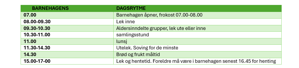 Barnehagen skal være et trygt og stimulerende læringsmiljø som legger til rette for barns helhetlige utvikling, basert på lek, omsorg, medvirkning og utforskning. I tråd med Rammeplan for barnehagens innhold og oppgaver, skal barnehagen være en arena for trivsel, læring og utvikling, der hvert barn får støtte til å bli seg selv og utforske sin verden.