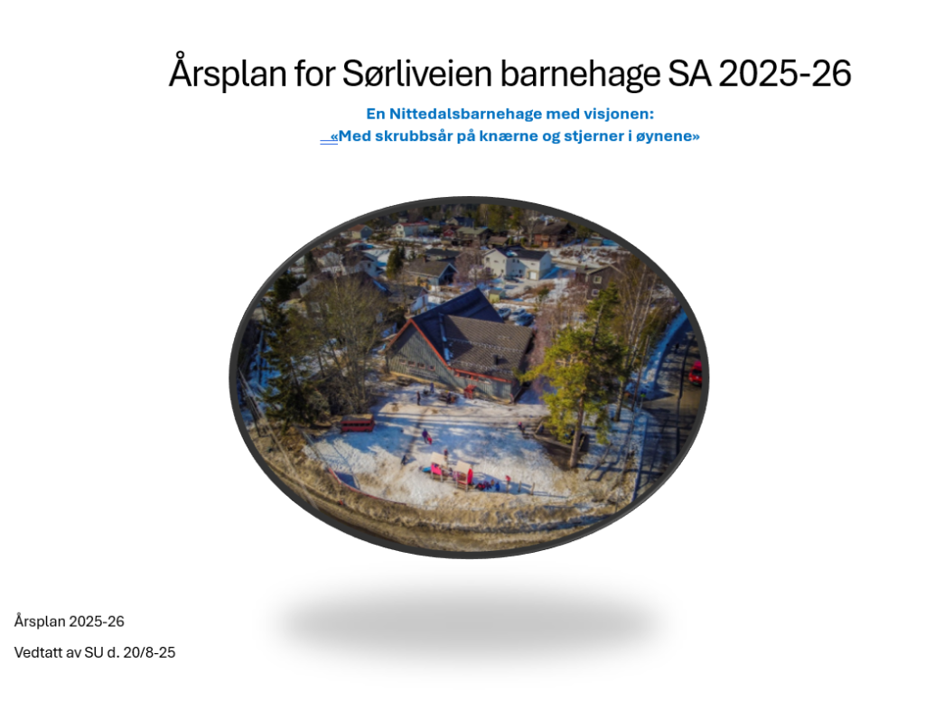 Et trygt og godt psykososialt barnehagemiljø er en grunnleggende rettighet for alle barn i Sørliveien barnehage, slik det er fastslått i barnehageloven § 41. Barnehagen har derfor utarbeidet en egen plan for å sikre at miljøet er inkluderende, støttende og fritt for mobbing, utestengelse og krenkelser. Denne planen legger vekt på både forebygging, tidlig avdekking og systematisk oppfølging dersom uheldige hendelser skulle oppstå. Gjennom faglig bevissthet, gode rutiner og et sterkt engasjement fra hele personalet, arbeider vi målrettet for at alle barn skal oppleve trygghet, respekt og tilhørighet i barnehagehverdagen. Handlingsplanen beskriver konkrete tiltak for å styrke det psykososiale miljøet, og sikrer at barnas stemmer og opplevelser blir tatt på alvor. Foreldresamarbeid og åpenhet står sentralt i arbeidet, slik at barn og foresatte alltid har noen å henvende seg til dersom de opplever eller har mistanke om krenkelser. På denne måten bygger vi et felles ansvar for at alle barn får en barnehagetid preget av trivsel, trygghet og utvikling.