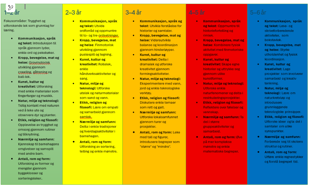 I barnehagealderen, fra 1 til 6 år, legges grunnlaget for barns helhetlige utvikling og læring. Rammeplanens 7 fagområder gir en solid basis for å strukturere aktiviteter og erfaringer som fremmer barnas vekst og trivsel. Denne planen følger fagområdene og tilrettelegger for en progresjon tilpasset barn i ulike aldersgrupper, samtidig som den gir rom for individuelle forskjeller.