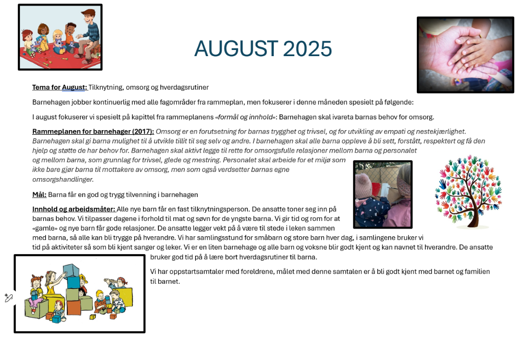 Dette barnehageåret har barnehagen valgt å ha månedsplaner og månedsmål som satsingsområde. Hver måned har eget mål og eget fagområde fra rammeplanen i fokus. Vi vil jobbe med månedens mål på samlinger og i aldersinndelte grupper. Aktivitetene knyttet opp mot månedens mål tilpasses alder og modenhet og skal tilrettelegges for en viss progresjon gjennom barnehagetiden.